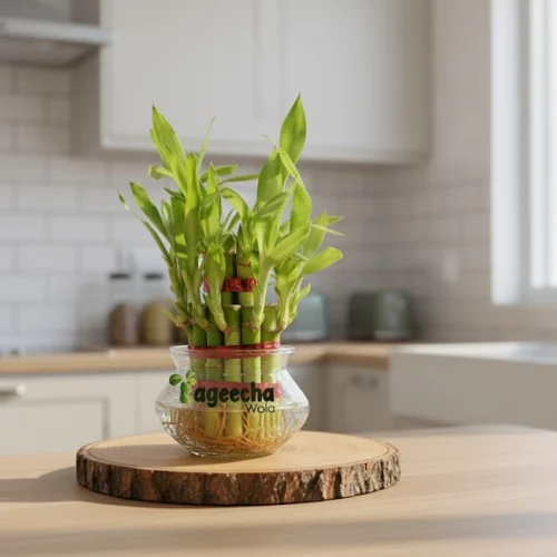 Bring luck, positivity, and beauty to your space with the 2 Layer Lucky Bamboo Plant from Bageechawala. Arranged in a clear glass jar with colorful stones, this low-maintenance plant symbolizes prosperity and harmony—perfect for homes, offices, or gifting on special occasions.